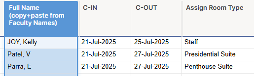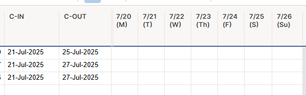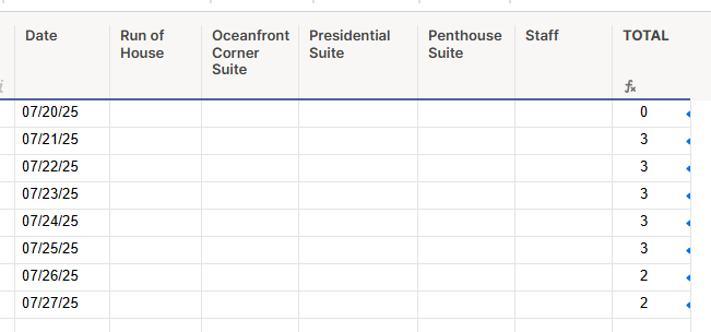 I have a form set up for people to enter their CHECK-IN and CHECK-OUT dates. I'm looking for a way to have the dates tallied for all reservations received. So for row 1 - a "1" would enter under 7/21, 7/22, 7/23 and 7/24. And for row 2 - "1" would enter in 7/21, 7/22, 7/23. etc. to 7/26.