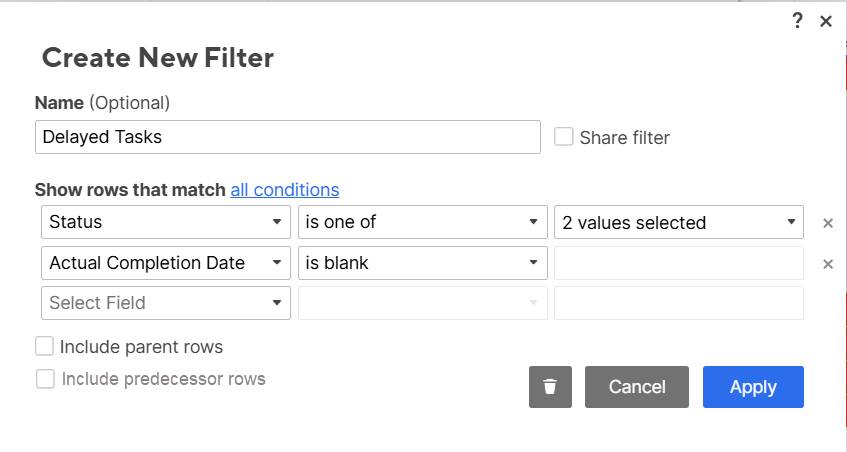 I would love to add the option to include predecessors/dependencies in my filter option (just like the ability to include parent rows - like a little checkbox).