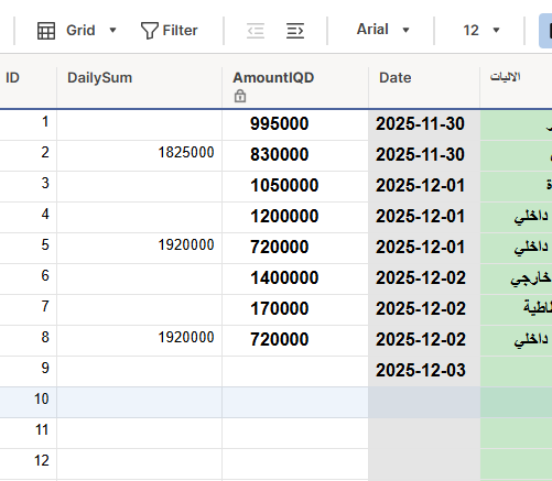as you can see in the picture bellow, I want to make a function to generate an auto sum for each day where any time day changes, I get the sum directly of the same day.