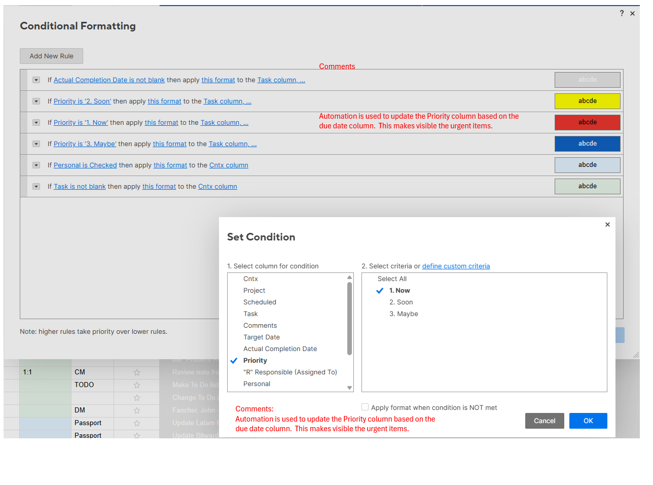When creating conditional formatting, it would be helpful to have a Comments field where you could add context on what the formatting is indicating, and why it is doing it. This is helpful when you have multiple people that manage the conditional formatting.