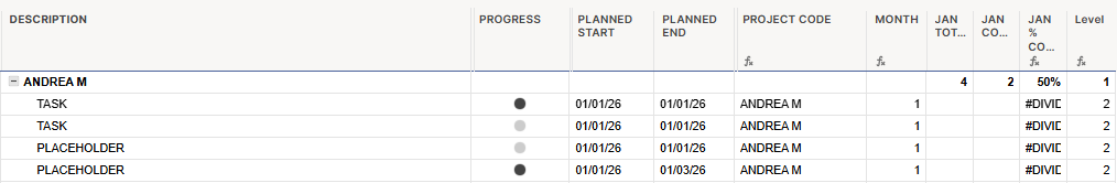 - Matches the name in the DESCRIPTION parent row to the name in the PROJECT CODE column in the child rows