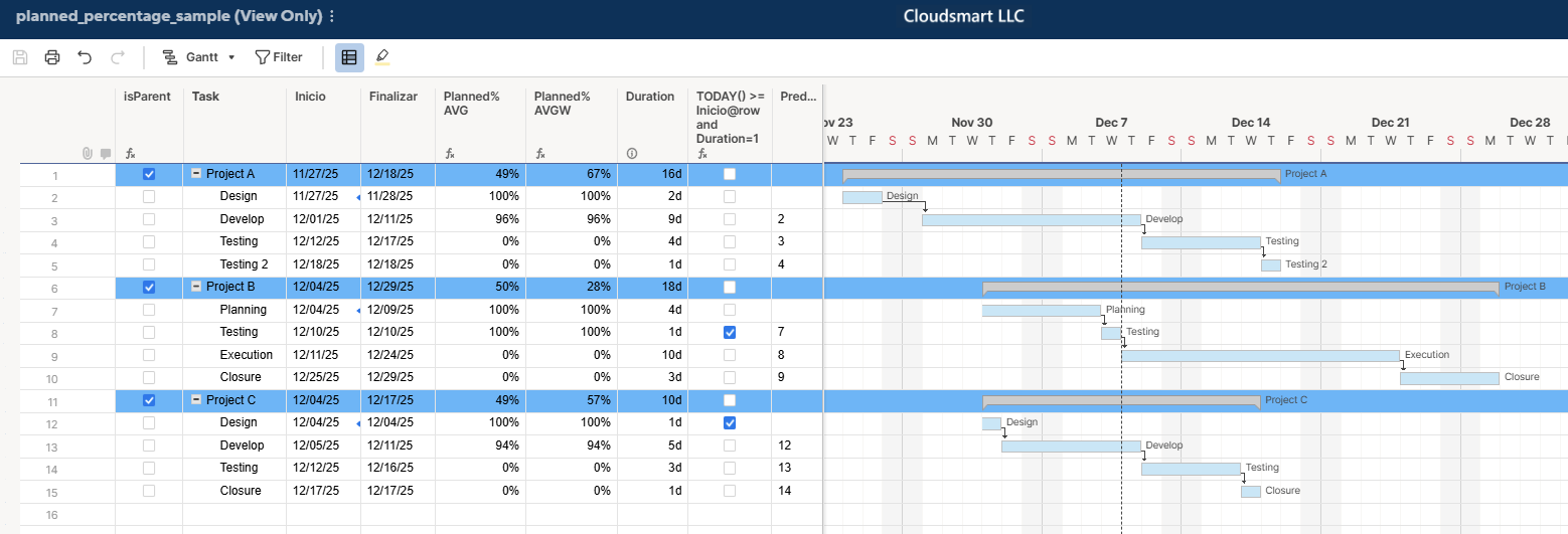 I created a new column to calculate the planned percentage in my project; however, in the father rows is not calculating correctly, even if I tied the percentage between complete and Planned, the percentage is not the same.